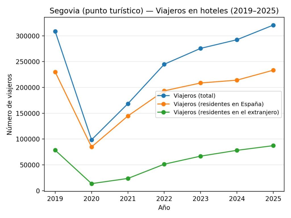 Segovia bate su propio récord turístico. Por primera vez, la ciudad ha superado los niveles de visitantes previos a la pandemia y ha firmado en 2025 el mejor año de su historia en número de viajeros que pernoctan en la capital.