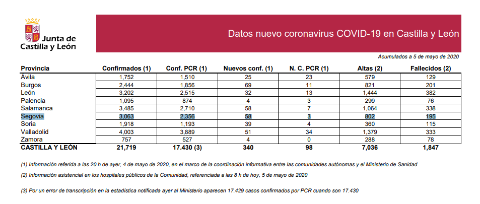En cifras totales, Segovia ha confirmado 3.063 pacientes contagiados. Nuestra ciudad ya no está lejos de la primera provincia con más contagios de Castilla y León: Valladolid con 4.003. En segundo lugar está Salamanca con 3.485, León en tercer lugar con 3.202 y Segovia en cuarto lugar. En último lugar, muy alejado de estas cifras se encuentran Zamora con 757 casos y Palencia con 1.095.