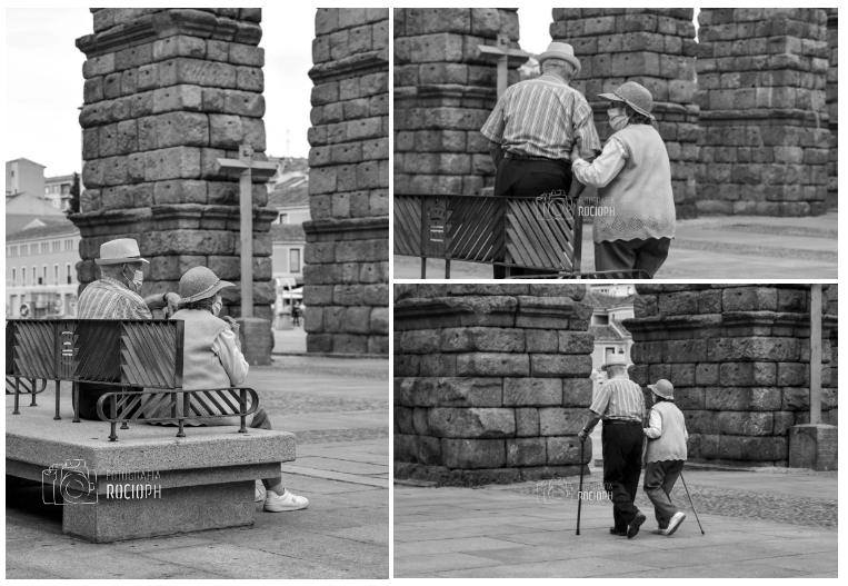 Rocío escribió en su blog: Sigo con lágrimas en los ojos desde que tomé esta foto a los pies del Acueducto y es que cada vez que veo la mirada que sostienen los dos, soy capaz de transportarme a muchos lugares y muchos momentos, y todos con algo en común: están llenos de amor. Amor por los míos, por los que están y me sostienen, y el amor más grande por los que se fueron y nos dejaron el aprendizaje de tantos años. Así era el amor que transmitían ellos sentados en el banco, ajenos a la situación que estaban viviendo, pero a la vez tan metidos, inevitablemente, en ella.
