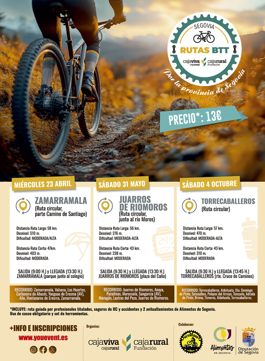 Las inscripciones ya están abiertas. Pueden hacerse a través de la web www.youevent.es. El número de plazas por actividad es de 50 y desde la Fundación Caja Rural de Segovia aseguran que es necesario tener una condición física buena, y ser capaz de pedalear durante 4 horas con un nivel técnico medio sobre la bicicleta.