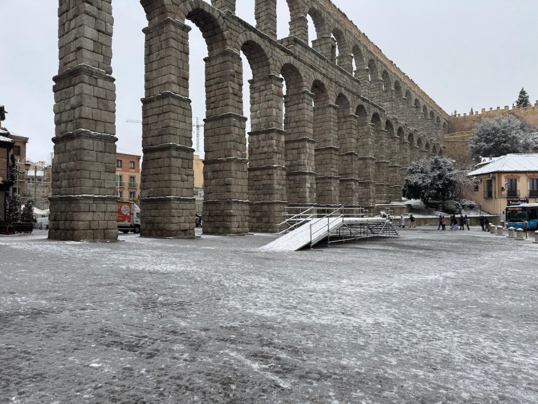 Las aceras heladas y los kilos de sal esparcidos desde primera hora han marcado la mañana más fría del episodio provocado por la borrasca Francis en Segovia. Aunque la nevada no ha sido especialmente intensa en la capital, el brusco descenso de las temperaturas sí ha transformado la nieve caída en placas de hielo, convirtiendo aceras en auténticas pistas de patinaje y complicando la movilidad tanto de peatones como de vehículos.