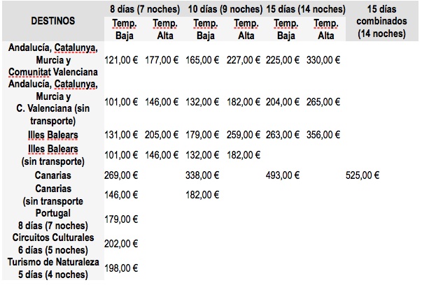 Los destinos a Canarias, Circuitos Culturales, Turismo de Naturaleza y Portugal se considerarán siempre temporada alta.