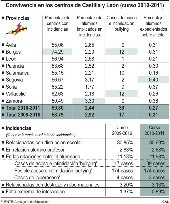 «Más de 1.500 alumnos que presentaban incidencias el pasado curso dejan de hacerlo, 500 dejan de reincidir en sus comportamientos negativos y 200 ya no presentan incidencias con carácter multireincidente», remarcaron desde el Gobierno autonómico. Asimimso, reseñaron que durante el curso 2010-2011, los centros educativos de Castilla y León aumentaron el carácter innovador en sus actuaciones correctoras. De esta forma, las actuaciones que incluyen procesos de acuerdo reeducativo y mediación, se elevaron en cerca de dos puntos porcentuales sobre el dato del curso anterior.