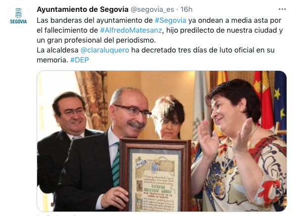 El Ayuntamiento ha enviado sus condolencias a la familia también a través de las redes sociales y han recordado la figura de «la voz de Segovia», como lo han hecho también numerosos compañeros y amigos: