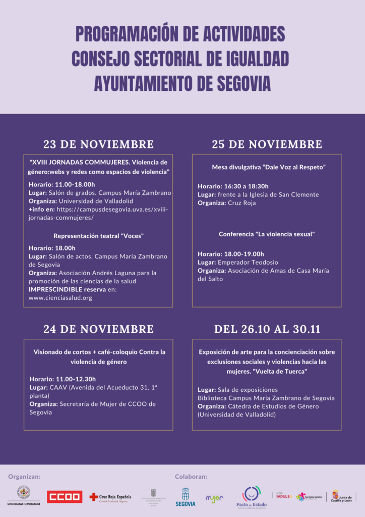 El jueves 25, Cruz Roja instalará, desde las 16:30 horas, una mesa divulgativa “Dale vos al respeto”, frente a la iglesia de San Clemente; y a las 18:00 horas en la residencia Emperador Teodosio, organizado por la asociación María del Salto, se celebrará la conferencia La violencia sexual.