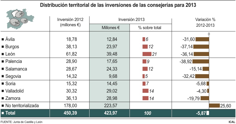 Porcentualmente, León se lleva el 21 por ciento del total de la inversión de las consejerías; Valladolid y Zamora, el 14 por ciento cada una, y Burgos y Salamanca, dos puntos menos, el 12 por ciento. La inversión para Segovia sólo supone el 5 por ciento, un punto más en el caso de Ávila, con un 6 por ciento, y llega al 7 por ciento en Soria, dos puntos menos que en Palencia, con el 9 por ciento.