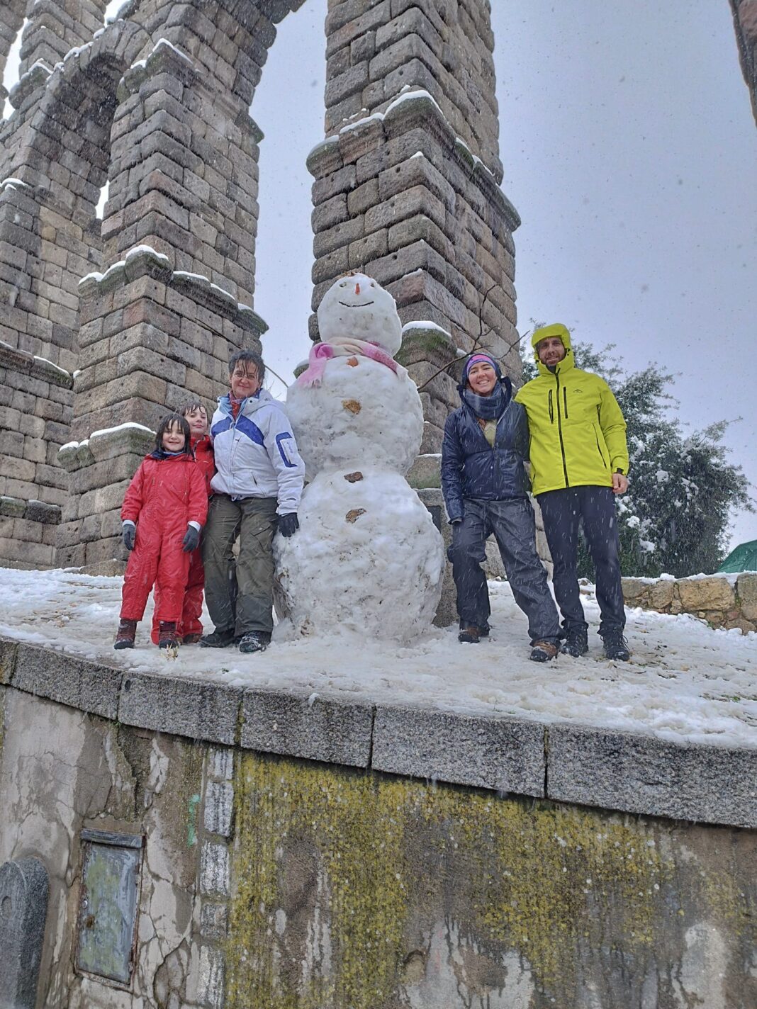 Los hacedores de este muñeco de nieve son Marta Asenjo, Mario Martín e Isabel Escobar y sus hijos Paula y Iago; con la ayuda de Natalia Ruano para la decoración. Todos ellos posan orgullosos al lado de su creación, la cual ha necesitado de unas tres horas, y la ayuda de otros dos turistas que pasaban por allí.