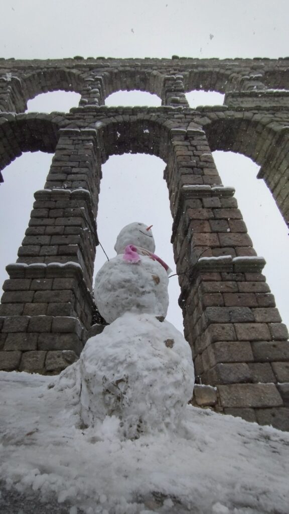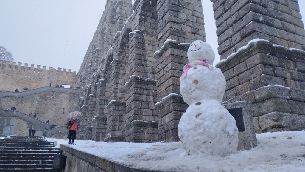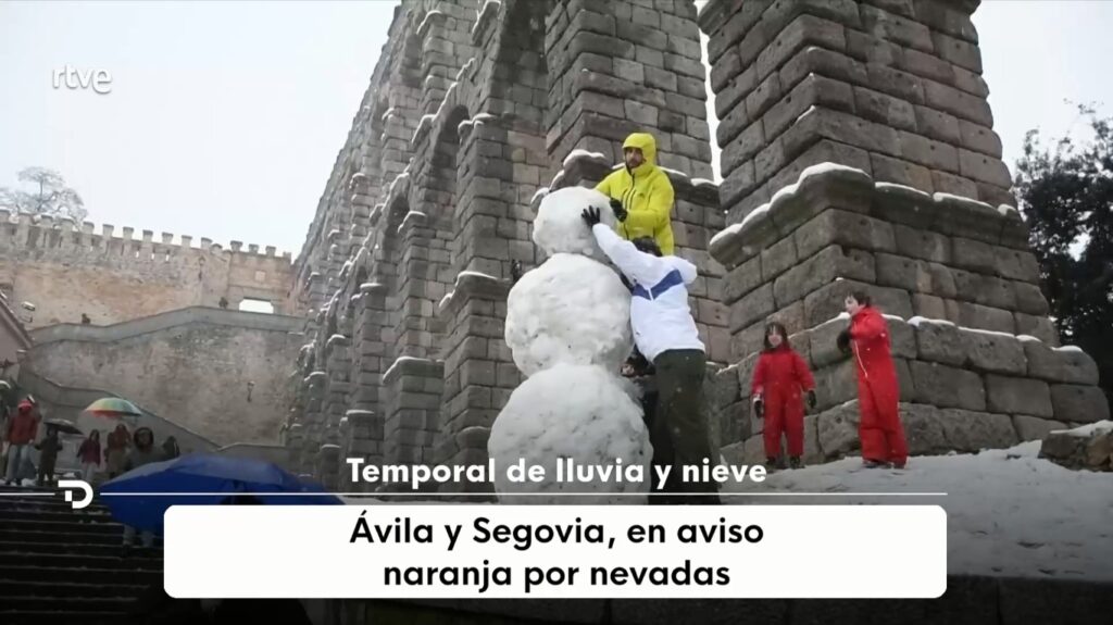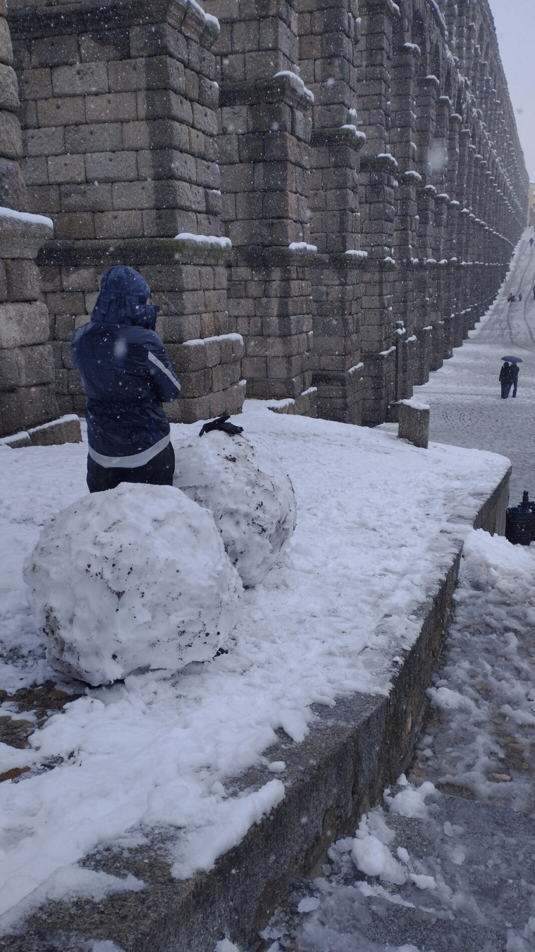 Según nos informaba Mario Marin Antón en la jornada de ayer, un gran muñeco de nieve se formaba en uno de los sitios más emblemáticos de Segovia, en el Acueducto. Casi dos metros y medio de atura, ubicado en la subida al Postigo, ha aparecido en el segundo Telediario de TVE durante unos minutos.