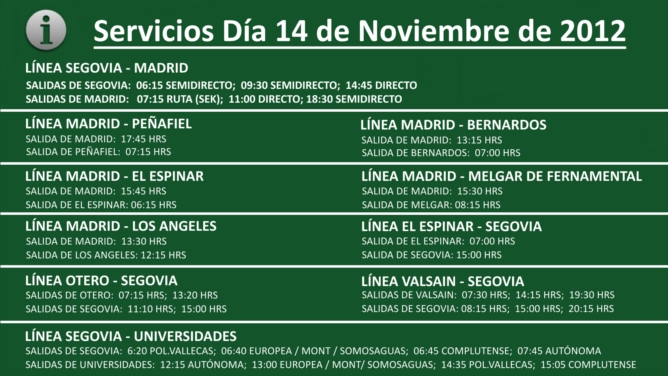 Por su parte, La Sepulvedana mantendrá siete expediciones a Madrid desde Segovia. La primera de ellas será a las 6:15 horas semidirecto; 6:20 horas (servicio universidad Vallecas); 6:40 (universidad Europea/Mont/Somosaguas); 6:45 horas (universidad Complutenses); a primera hora de la mañana. Posteriormente, habrá un servicio a las 9:30 horas semidirecto y a las 14:45 horas uno directo. Según comunicaron fuentes de la empresa, estos serán los únicos servicios con la capital madrileña que ofrecerán mañana.