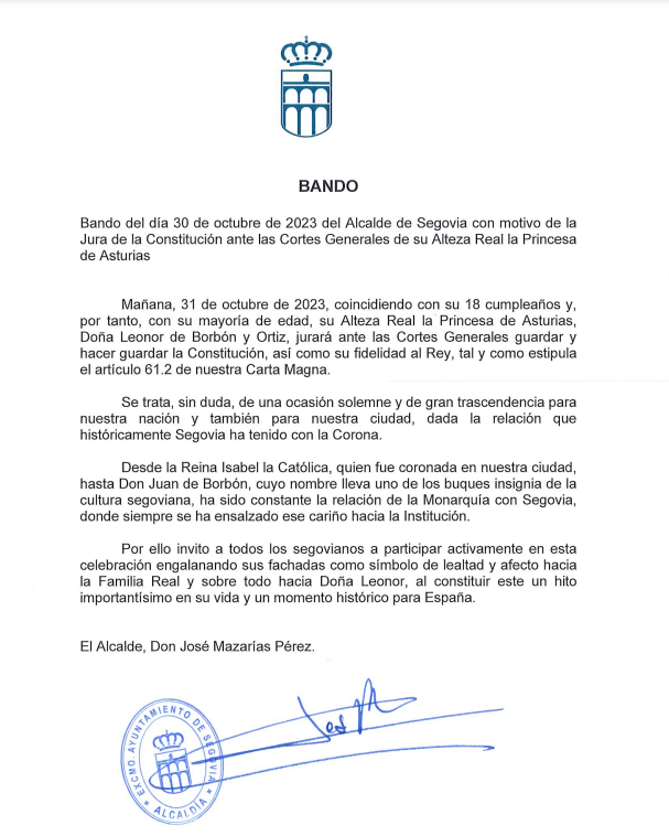 Por ello, «invito a todos los segovianos a participar activamente en esta celebración engalanando sus fachadas como símbolo de lealtad y afecto hacia la Familia Real y sobre todo hacia Doña Leonor, al constituir este un hito importantísimo en su vida y un momento histórico para España», señala el bando firmado por José Mazarías.