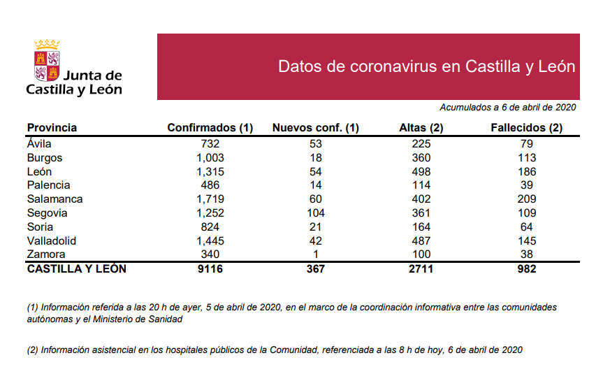 CASTSILLA Y LEÓN: 367 CASOS CONFIRMADOS DESDE AYER EN LA COMUNIDAD, PARA UN TOTAL DE 9.116 POSITIVOS, CON 2.711 ALTAS HOSPITALARIAS Y 982 FALLECIMIENTOS