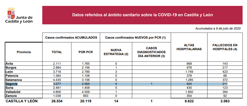 CASTILLA Y LEÓN SUMA 26.534 CASOS POSITIVOS DE COVID-19, CON UN TOTAL DE 20.119 CONFIRMACIONES POR PCR