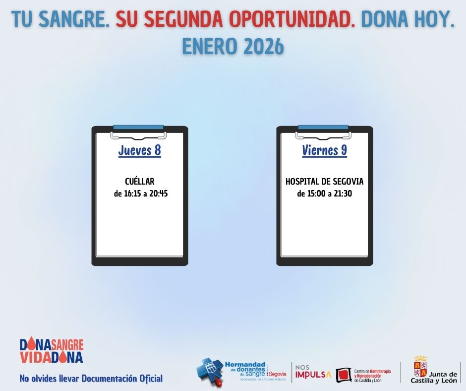 El 8 de enero, en el Centro Municipal Santa Clara de Cuéllar. Este está situado en la Plaza de las Piscinas y atenderá a los donantes entre las 16:15 y las 20:45 horas.