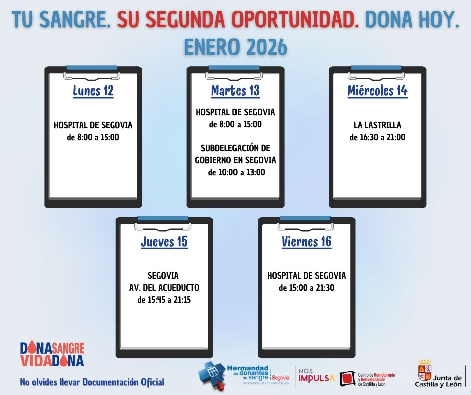Para incentivar las donaciones de sangre tanto en la ciudad como en las zonas rurales de la provincia, la Hermandad de Donantes de Sangre de Segovia la programación de colectas para los próximos días de enero.