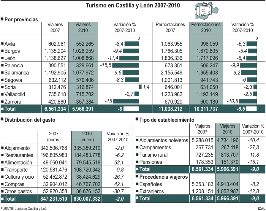 El número de viajeros que acudieron a Castilla y León se ha reducido un 9,06% en los últimos tres años. De este modo, desde el inicio de la crisis económica se ha registrado casi 600.000 visitantes menos, al pasar de los 6,56 millones en 2007 a los 5,96 de 2010, según la comparativa de los boletines de coyuntura turística de Castilla y León de estos años. El número de pernoctaciones también descendió y lo hizo en un 6,5% debido a que en 2007 se registraron en los diversos alojamientos turísticos de Castilla y León algo más de once millones, mientras que en 2010 la cifra fue de 10,3 millones.