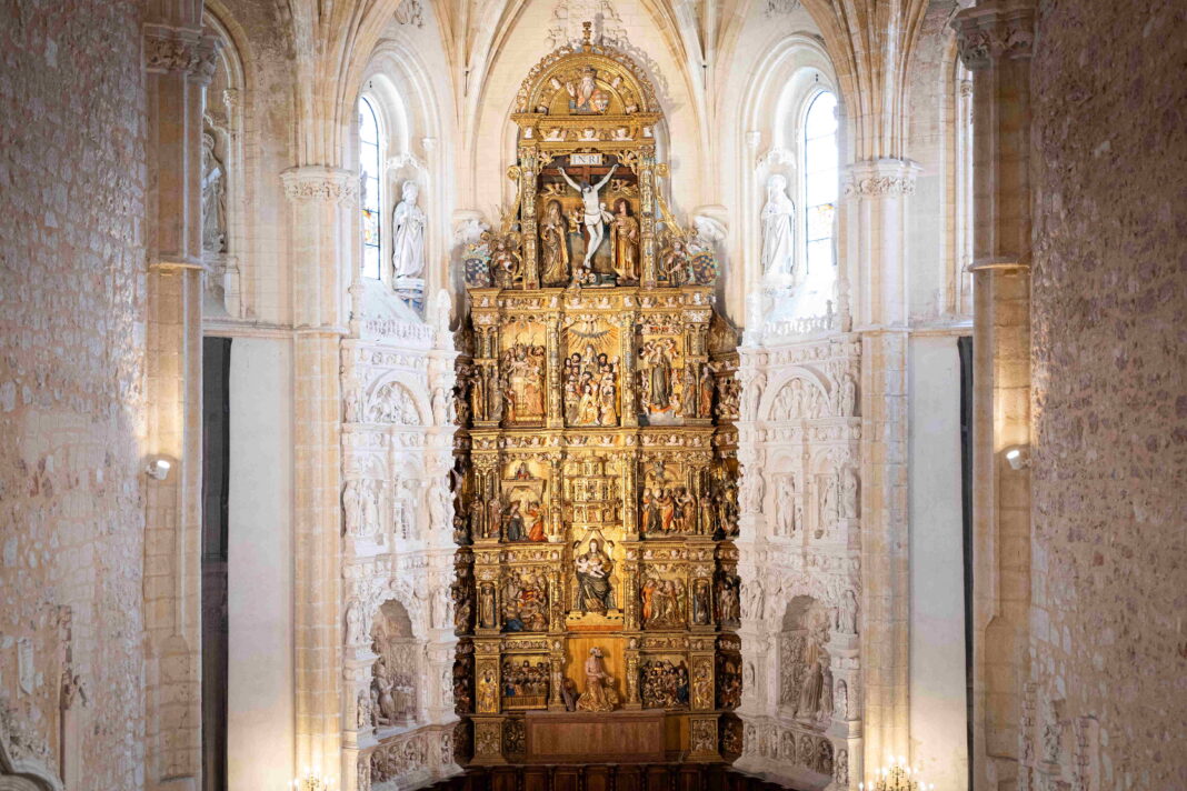 El retablo, realizado en madera dorada y policromada, destaca por su monumentalidad y por la calidad de las escenas escultóricas que lo conforman. Formado por cuatro cuerpos, un ático y un remate, muestra todo un entramado de calles y entrecalles decoradas con relieves de temática cristológica. Además, con una iconografía más compleja, los cenotafios, realizados en piedra dolomía y alabastro, siguen modelos propios de la tradición castellana.