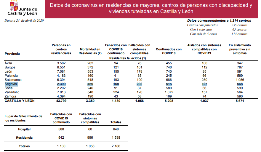 Segovia es la cuarta provincia de la comunidad con mayor mortalidad en residencias (459 fallecidos), sólo superada por León (553), Salamanca (548) y Valladolid (540).
