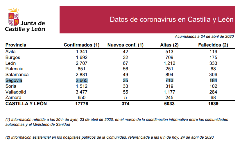 En cifras totales, Segovia ha confirmado 2.665 pacientes contagiados. Nuestra ciudad ya queda lejos de la primera provincia con más contagios de Castilla y León: Valladolid con 3.477. En segundo lugar está Salamanca con 2.881, León en tercer lugar con 2.707 y Segovia en cuarto lugar. En último lugar, muy alejado de estas cifras se encuentran Zamora con 650 casos y Palencia con 851.