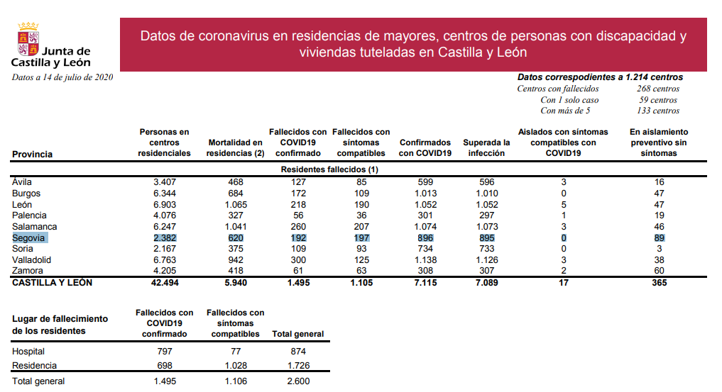 La Junta de Castilla y León reconoció al inicio de la pandemia que el número de fallecidos no es posible darlo con exactitud. Hasta el momento, la cifra de fallecidos facilitada por las autoridades es de 404.