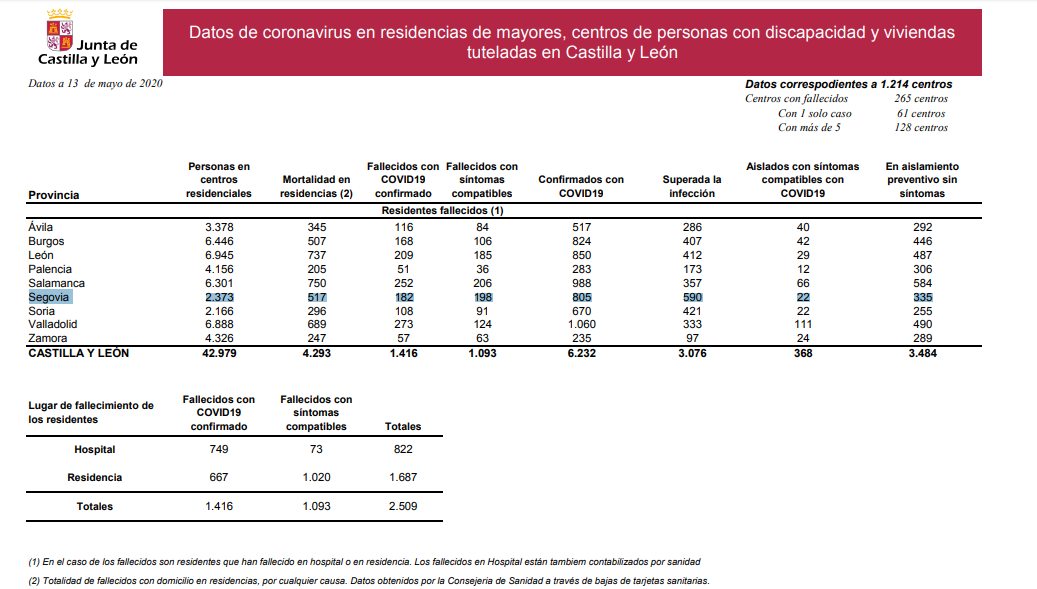 La Junta ha reconocido que el número de fallecidos no es posible darlo con exactitud ya que algunos residentes (sin especificar por las autoridades) fallecen en el Hospital. La realidad es que el número de residentes que ha fallecido diagnosticados como positivos asciende a 381. Una cifra que no ha aumentado en las últimas 24 horas.