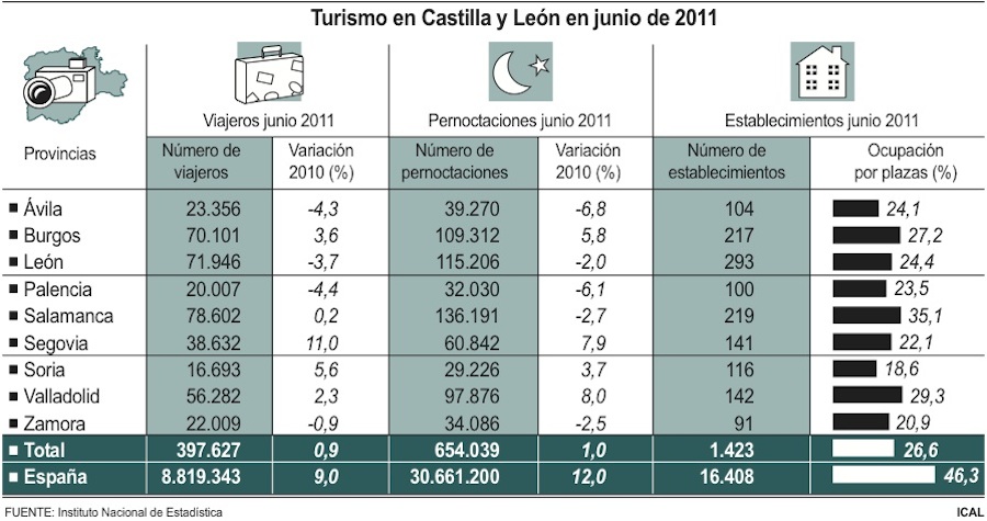 Las pernoctaciones en establecimientos hoteleros aumentaron un 1% en Castilla y León en junio sobre el mismo mes de 2010, frente al incremento de la media nacional del 10,9%. En concreto, la región pasó de registrar 647.388 pernoctaciones en el sexto mes del año pasado a las 654.039 de éste, según los datos de coyuntura turística hotelera publicados hoy por el Instituto Nacional de Estadística (INE). En cuanto a la cifra de viajeros, registró un aumento en la Comunidad del 0,95%, al cerrar junio con 397.627 visitantes.