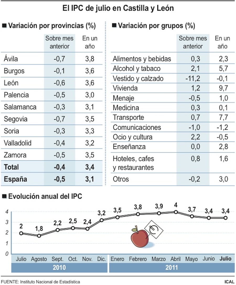 Los precios bajaron en Castilla y León en el mes de julio el 0,4% respecto a junio, lo que supone una décima menos que el descenso anotado por el conjunto de las comunidades, que fue del 0,5%. Así, la tasa interanual se mantiene en el 3,4%, tres décimas por encima de la nacional (3,1), según los datos facilitados hoy por el Instituto Nacional de Estadística. Sin embargo, en lo que va de año, los precios aumentaron en la región el 0,7%, igual que la media nacional.