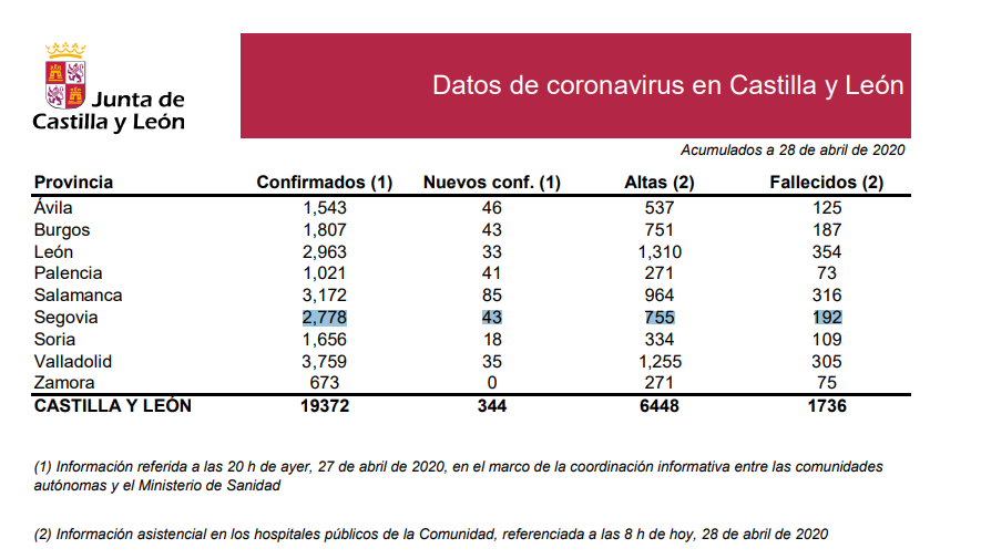 En cifras totales, Segovia ha confirmado 2.778 pacientes contagiados. Nuestra ciudad ya queda lejos de la primera provincia con más contagios de Castilla y León: Valladolid con 3.759. En segundo lugar está Salamanca con 3.172, León en tercer lugar con 2.963 y Segovia en cuarto lugar. En último lugar, muy alejado de estas cifras se encuentran Zamora con 673 casos y Palencia con 1.021.
