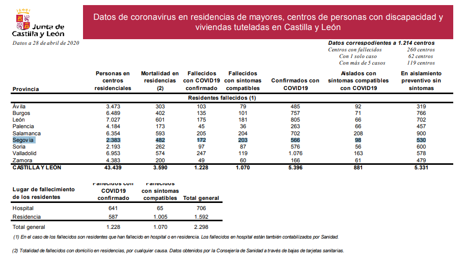 La Junta ha reconocido que el número de fallecidos no es posible darlo con exactitud ya que algunos residentes (sin especificar por las autoridades) fallecen en el Hospital. La realidad es que el número de residentes que ha fallecido diagnosticados como positivos asciende a 364, 1 más en las últimas 24 horas. De los cuales 192 han fallecido en el Hospital y 172 en Residencias de Mayores y Centros de Personas con discapacidad, a los que hay sumar otros 203 fallecidos en residencias, relacionados pero sin hacer prueba diagnóstica, los probables del hospital y los domicilios. Es decir, una dramática e incompleta cifra.