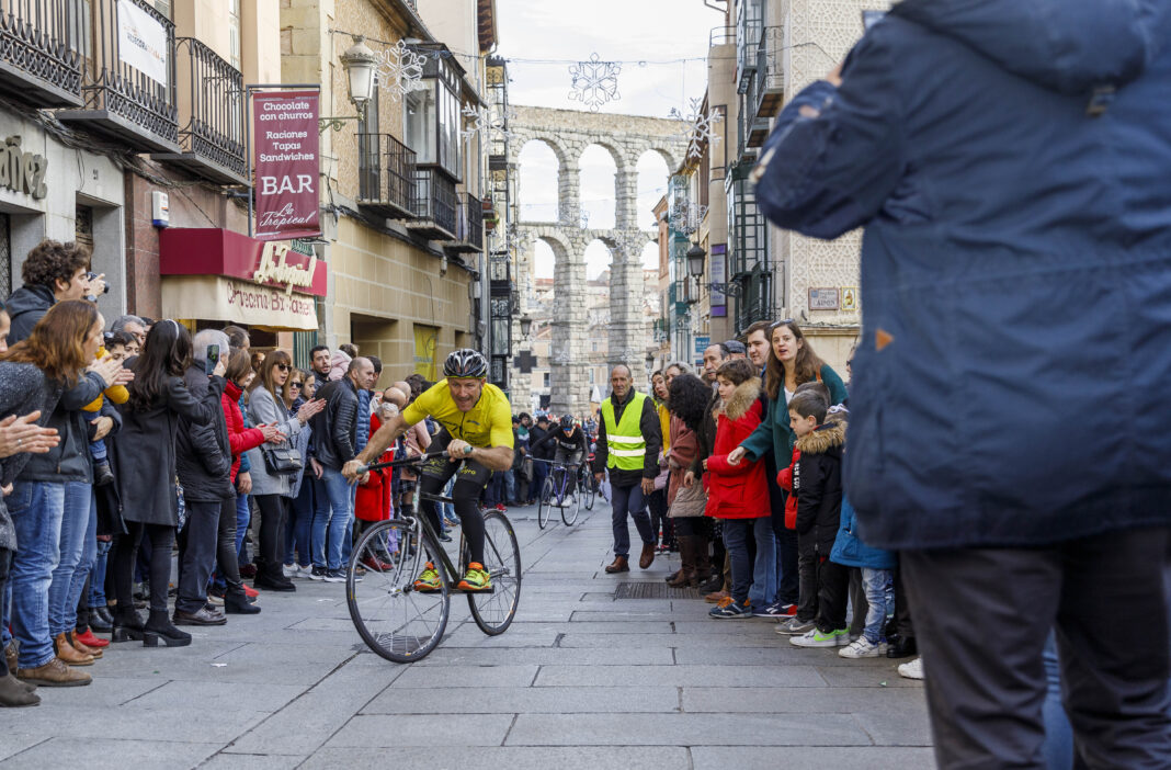Las calles del centro de Segovia se llenaron de vecinos y turistas para aplaudir en esta tradicional mañana de Navidad a los 74 ciclistas que hoy participaron en la LXXX edición de la Carrera del Pavo en la que, impulsados con su propio cuerpo, deben aprovechar la bajada junto al Acueducto, testigo histórico de la prueba, subidos en bicicletas sin cadenas para alcanzar la meta cuesta arriba.