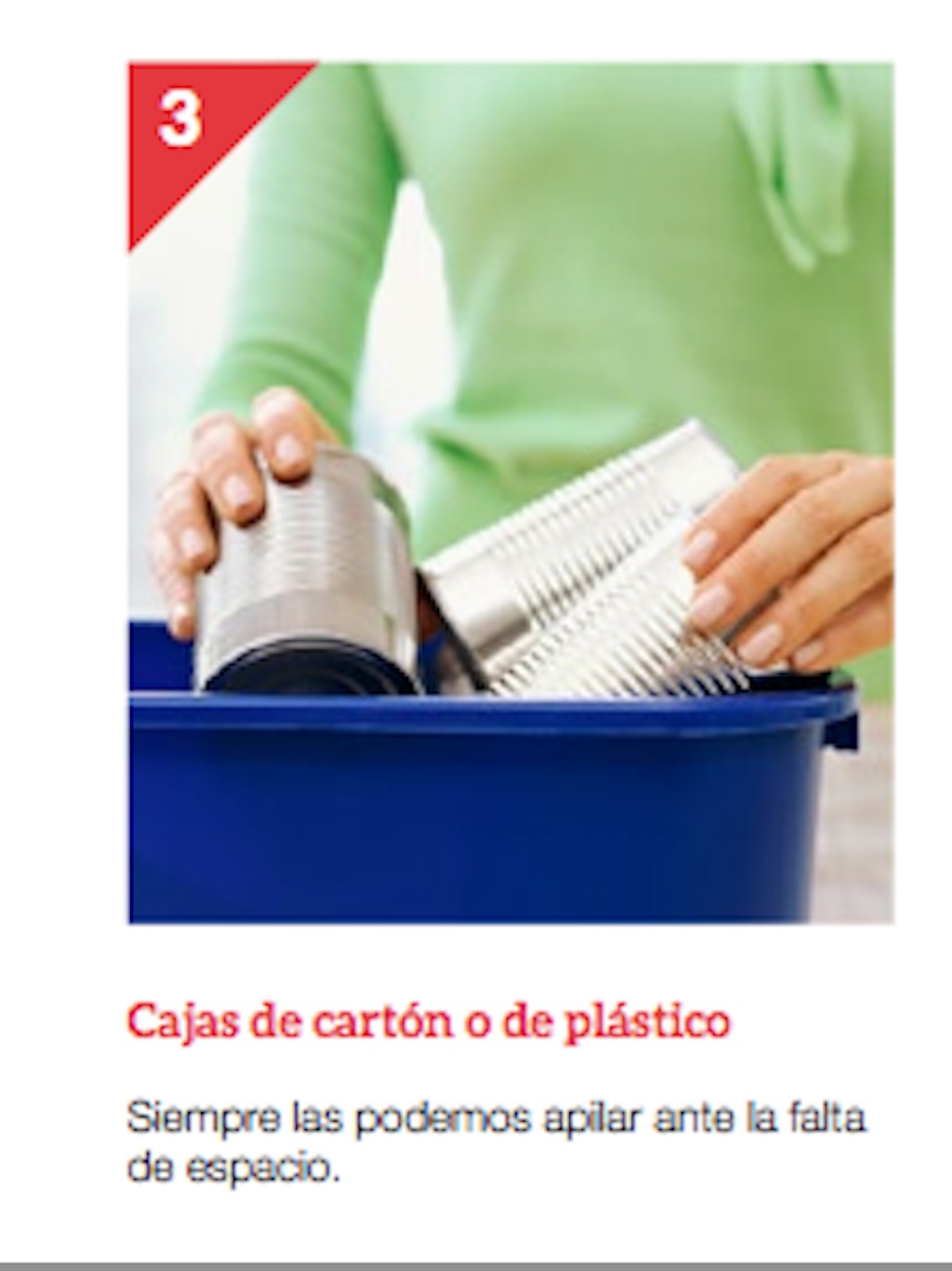 Así, en la primera página, y tras la portada, se puede observar cómo una chica desecha un envase de plástico en un contenedor de color azul, distintivo utilizado para el papel. Y aunque, en la página seis, un abanico de colores guía sobre qué residuos hay que desechar en cada contenedor, la página ocho muestra una vez más, el contenedor azul, siendo esta vez el destino de dos latas que deberían ir al amarillo.