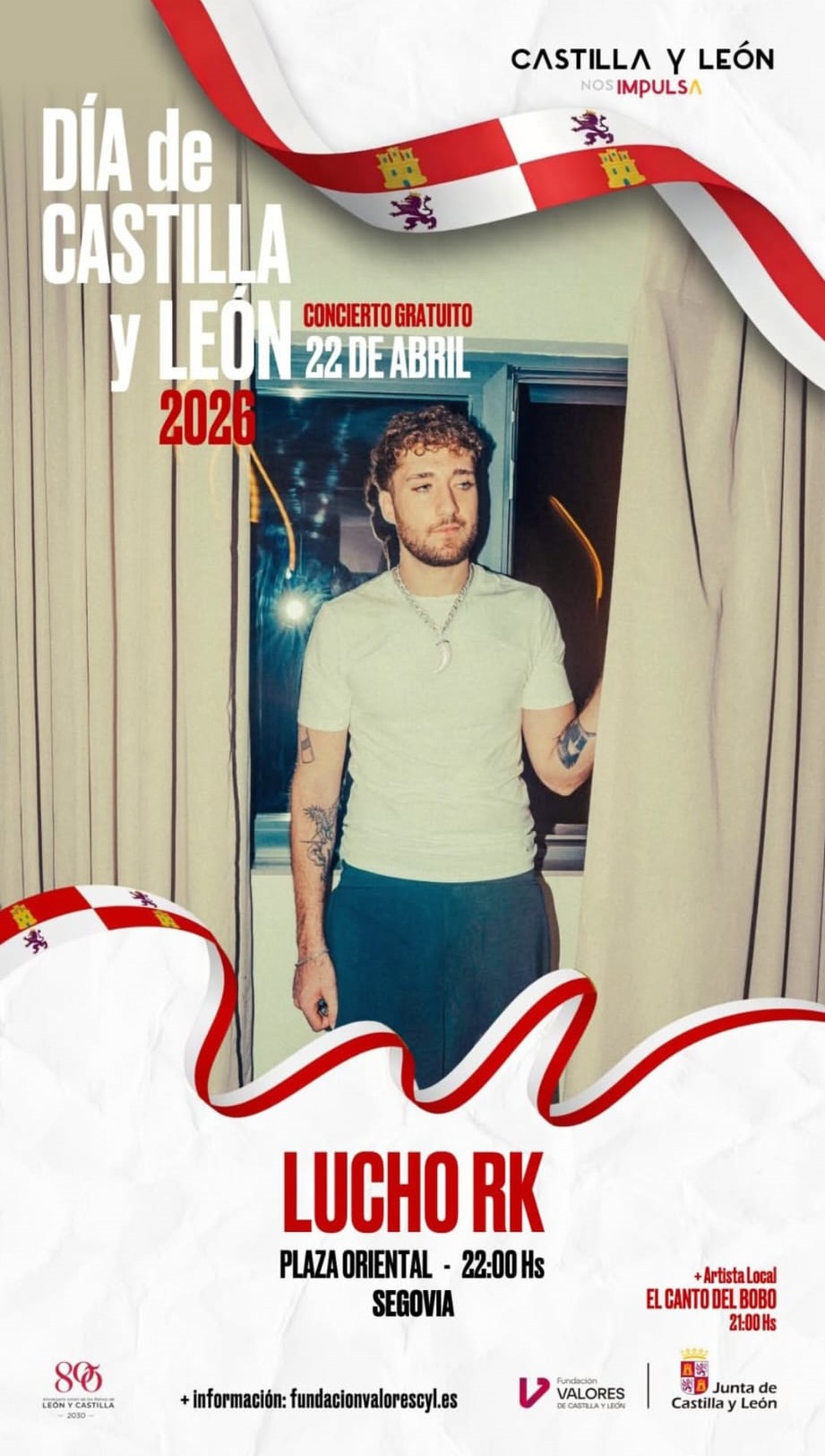 La ciudad de Segovia será uno de los escenarios protagonistas de la celebración del Día de Castilla y León 2026, con un gran concierto gratuito de Lucho RK que tendrá lugar la noche del 22 de abril. El artista encabezará un cartel que busca atraer a públicos de todas las edades y convertir la víspera de la festividad en una cita musical multitudinaria.