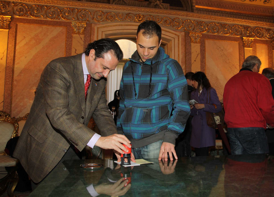 Arahuetes sella la credencial a uno de los participantes /Imagen por Rosa Blanco