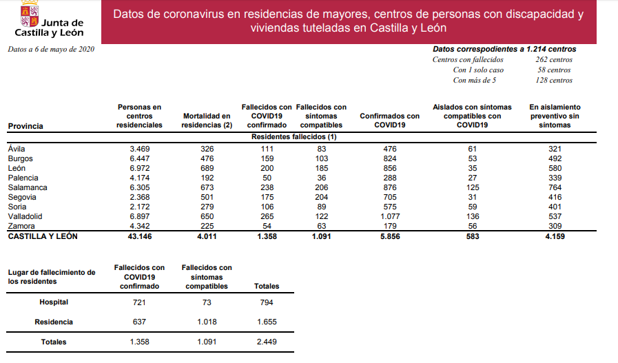 La Junta ha reconocido que el número de fallecidos no es posible darlo con exactitud ya que algunos residentes (sin especificar por las autoridades) fallecen en el Hospital. La realidad es que el número de residentes que ha fallecido diagnosticados como positivos asciende a 370. Un único fallecido en Residencias de Mayores.