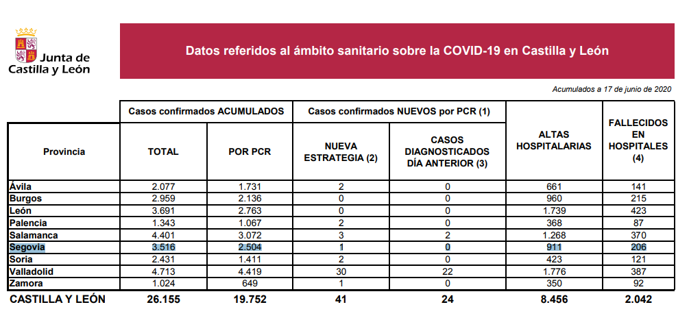 Castilla y León notifica hoy 41 nuevos casos de la enfermedad COVID-19, lo que sitúa su número actual en 26.155; de esa cifra, 19.752 tienen confirmación mediante PCR.