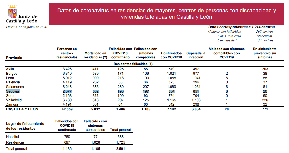 La Junta de Castilla y León reconoció al inicio de la pandemia  que el número de fallecidos no es posible darlo con exactitud. Hasta el momento, la cifra de fallecidos facilitada por las autoridades es de 396.