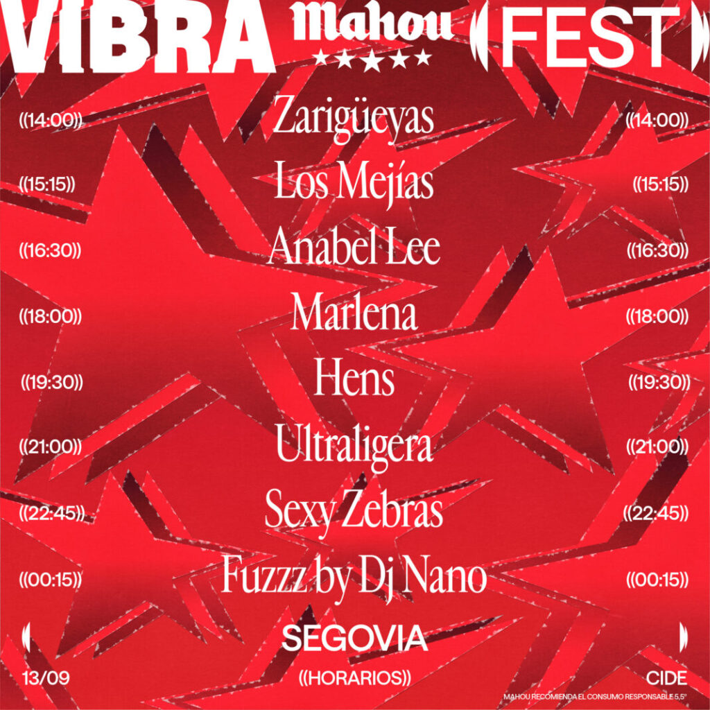 Solo quedan 10 días para que el Vibra Mahou Fest llegue a la ciudad de Segovia. El festival de la plataforma de música de Mahou Cinco Estrellas se estrenará en la capital segoviana el próximo sábado, 13 de septiembre, con una propuesta de más de 12 horas de música ininterrumpida con algunos de los artistas con mayor proyección del panorama del indie nacional. Ya conocíamos el nombre de los artistas que actuarán, pero la organización acaba de desvelar los horarios y el orden de las actuaciones.