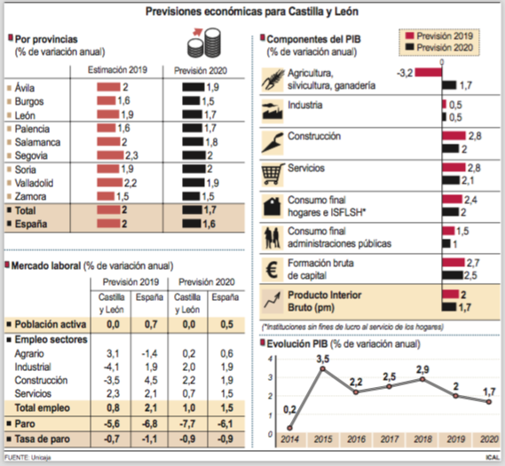En cuanto a las estimaciones para 2020, Castilla y León crecerá este año (1,7 por ciento) pero, al igual que en el conjunto del país, se va a tasas “más moderadas”, principalmente motivadas por la incertidumbre internacional, por las tensiones comerciales, así como, aunque en menor medida, a la espera de ver las políticas económicas que acomete el nuevo Gobierno español.