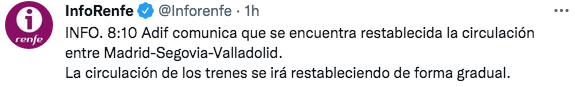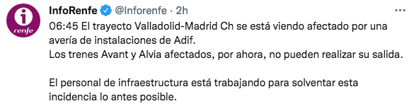 Según informaba InfoRenfe en su perfil de Twitter a las 06:45 «el trayecto Valladolid-Madrid Ch se está viendo afectado por una avería de instalaciones de Adif. Los trenes Avant y Alvia afectados, por ahora, no pueden realizar su salida. El personal de infraestructura está trabajando para solventar esta incidencia lo antes posible». Posteriormente, a las 8:10 anunciaba el restablecimiento de la circulación de forma gradual.