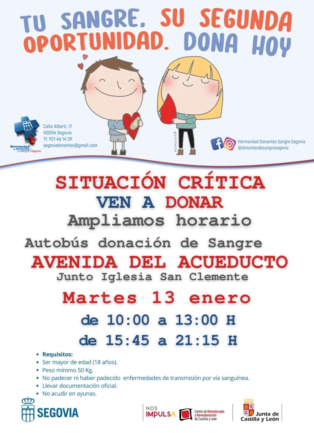 El punto fijo para donar sangre está ubicado en el Hospital General de Segovia. Los lunes y martes se puede acudir de 8:00 a 15:00 horas y los viernes de 15:00 a 21:30 horas.