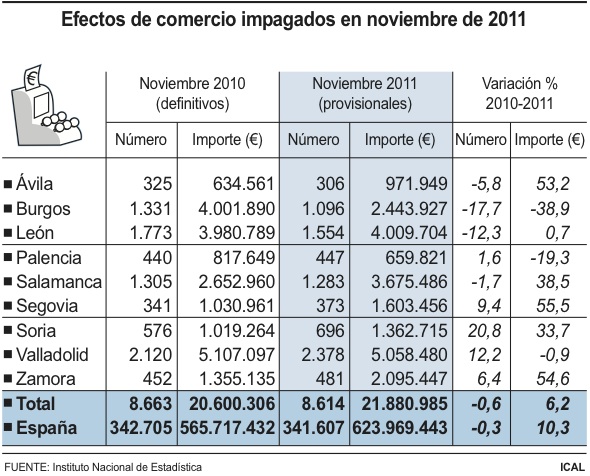 Respecto a Castilla y León, el volumen de efectos de comercio impagado, se mantuvo en noviembre sobre el mismo mes de 2010, al caer un 0,57 por ciento, hasta los 8.614. Si bien, el importe creció un 6,22 por ciento, hasta los 21,88 millones de euros, según los datos publicados hoy por el Instituto Nacional de Estadística (INE). Mientras, en España, el número de impagados descendió el 0,3 por ciento, con 341.605 y aumentó el importe de los mismos el 10,3 por ciento, con 623,9 millones.