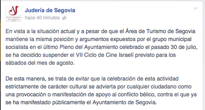 El Ayuntamiento de Segovia decidió suspender finalmente el VII Ciclo de Cine Israelí previsto para los sábados del mes de agosto dentro de la oferta cultural del Centro Didáctico de La Judería de Segovia.