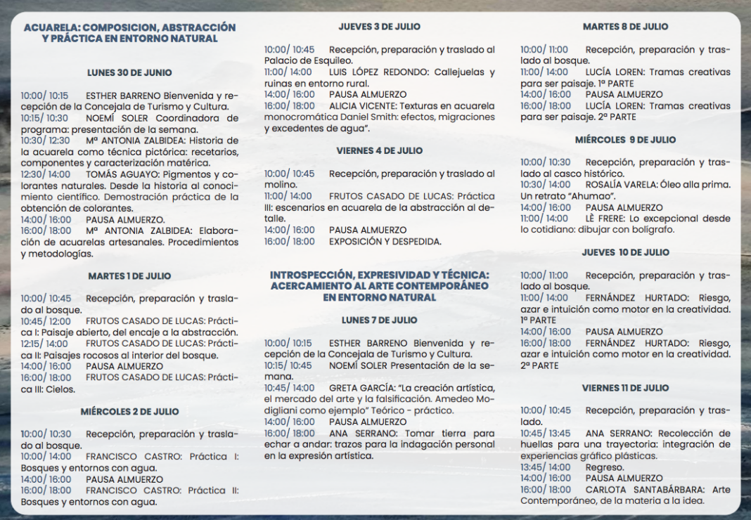 Para ello se realizarán so semanas de formación encuadradas entre el 30 de junio y el 11 de julio, con clases teóricas y prácticas realizadas por artistas de índole local, nacional e internacional de lunes a viernes, en jornadas de mañana y tarde.