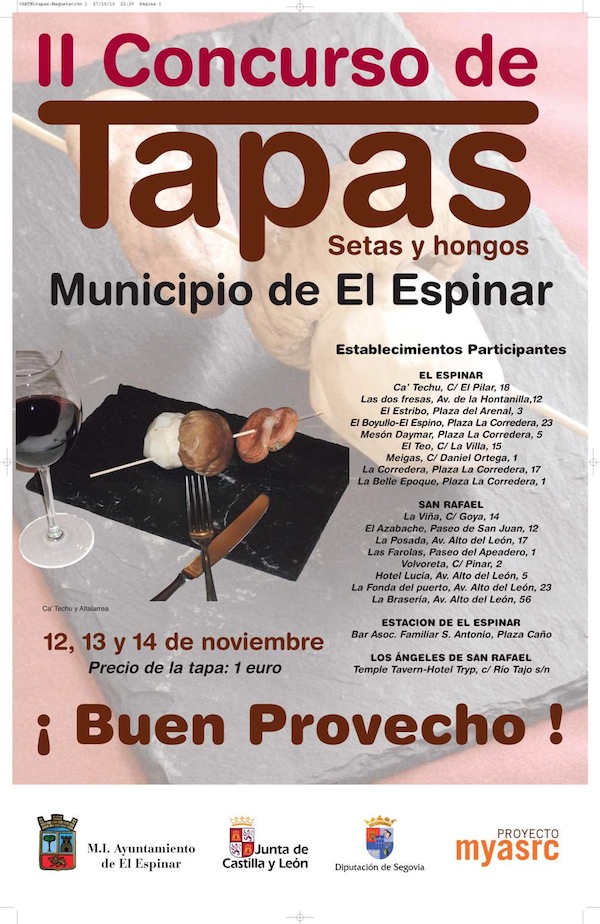 18 establecimientos del municipio de El Espinar ofrecerán tapas a un euro y cuyo ingredientes fundamental son setas y hongos. La II edición del Concurso de Tapas Micológicas se celebra durante este fin de semana del 18 al 20 de noviembre y del 25 al 27. El Alcalde de El Espinar, Francisco Eloy Jorge Gómez destaco la importancia que para el municipio supone el aprovechamiento de sus recursos naturales y la apuesta firme por lograr que sea un referente en el sector del turismo gastonómico y del Micoturismo. Este proyecto se basa fundamentalmente en regular la comercialización de las setas silvestres para que las rentas que se generen se queden en los Municipios, garantizando además las normas básicas de sanidad.