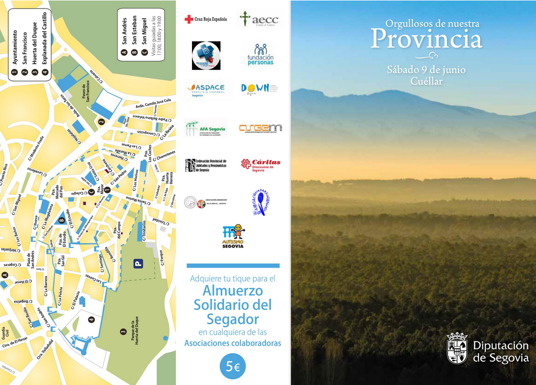 Allí está previsto que se celebre un almuerzo solidario del segador, a beneficio de trece organizaciones sociales de Segovia que han querido colaborar con este Día de la Provincia. En el caso de que las condiciones meteorológicas no permitieran servir allí el almuerzo, la comida, así como las actividades que estaba previsto desarrollar por la tarde en la Huerta del Duque, se trasladarían al polideportivo cubierto municipal Santa Clara.