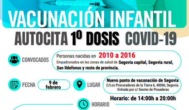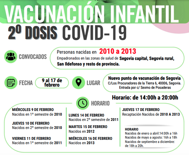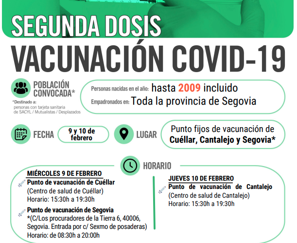 En concreto, el miércoles 9 de diciembre, se inicia la vacunación con segunda dosis a este grupo de edad en el punto de vacunación de Segovia capital, para los residentes en las zonas básicas de salud Segovia I, II, y III, Segovia Rural y San Ildefonso, y en los centros de salud de Sepúlveda, Sacramenia, Fuentesaúco de Fuentidueña y Navafría (zona básica de salud de La Sierra). El jueves 10 de febrero, comienza la administración de segundas dosis a los menores en el centro de salud de Cuéllar; el viernes, 11 de febrero, en los centros de salud de Villacastín, Carbonero el Mayor, Riaza y El Espinar; el 14 de febrero, en el centro de salud de Cantalejo; y el 15 de febrero, en el centro de salud de Nava de la Asunción.