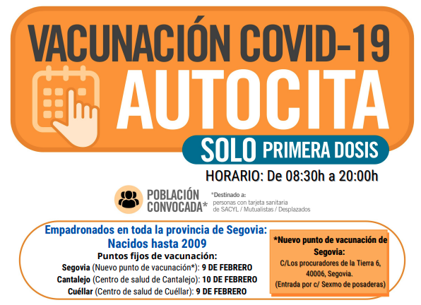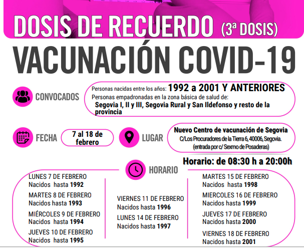 El 7 de febrero también empieza a vacunarse con dosis de recuerdo en los centros de salud de Fuentesaúco de Fuentidueña, Sacramenia, Nava de la Asunción y Carbonero el Mayor, a los mayores de 20 años residentes en estas zonas básicas de salud. El martes, 8 de febrero, se inicia la vacunación en Riaza, Villacastín, Sepúlveda y Navafría (La Sierra), a los usuarios de estas zonas básicas. El jueves, 10 de febrero, comienza a administrarse la tercera dosis a este grupo de edad en los centros de salud de El Espinar y Cantalejo y el miércoles, 16 de febrero, en el centro de salud de Cuéllar.