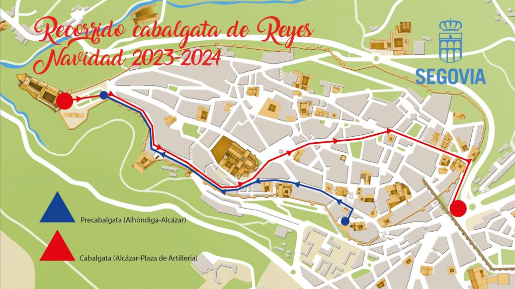 La Cabalgata iniciará su camino hacia la plaza de la Artillería por la ronda de Juan II, junto a la muralla. Los Magos de Oriente irán en andas hasta la plaza del Socorro, y desde allí continuarán a pie por la calle Martínez Campos hasta la calle San Frutos, donde volverán a subirse a las andas para entrar en la Plaza Mayor. En este punto les esperan tres espectaculares carrozas, de 9 metros de largo por 3 de ancho, una de las principales novedades de este año. Ya en ellas, continuarán su recorrido junto a sus pajes y sus séquitos reales, por las calles Cronista Lecea, plaza de la Rubia, calle Serafín, plaza del Doctor Laguna, la calle San Facundo, San Agustín y la plaza de Conde Cheste y bajarán por la calle San Juan para finalizar a los pies del Acueducto, en la plaza de Artillería, donde sus majestades recibirán a los niños.