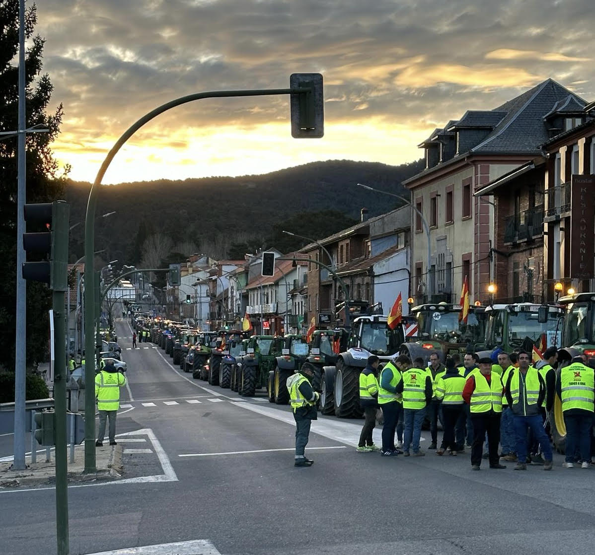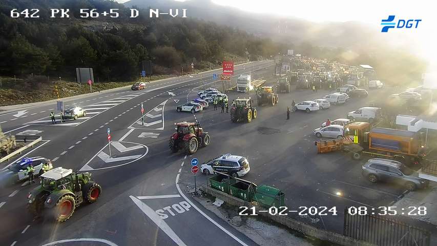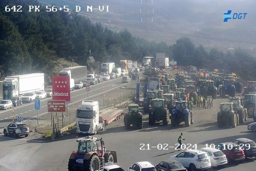 Así está el Alto del León, donde concluyen la Comunidad de Castilla y León, en la provincia de Segovia, con la Comunidad de Madrid, con tractores entre Segovia y Madrid.