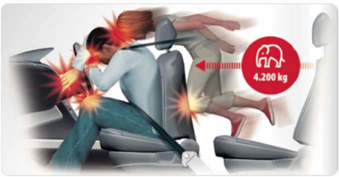El riesgo que implica que los pasajeros no se abrochen el cinturón de seguridad no es solo que se lesionen ellos mismos en caso de accidente, sino que golpearán los asientos delanteros con la fuerza de su peso, multiplicada por la velocidad a la que circulen –ya que no son retenidos por el cinturón de seguridad-. Y a una velocidad tan baja como 60km/h, un pasajero que pese 75 kilos golpearía el asiento delantero con una fuerza equivalente al peso de un elefante de 4,2 toneladas.