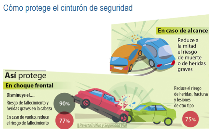 El cinturón de seguridad es el elemento de seguridad pasiva más eficaz de los vehículos y el que más vidas ha salvado. La Organización Mundial de la Salud en su informe La necesidad de cinturones de seguridad y sistemas de retención infantil recoge que el uso de estos dispositivos reduce la probabilidad de resultar muerto de aproximadamente un 50%.